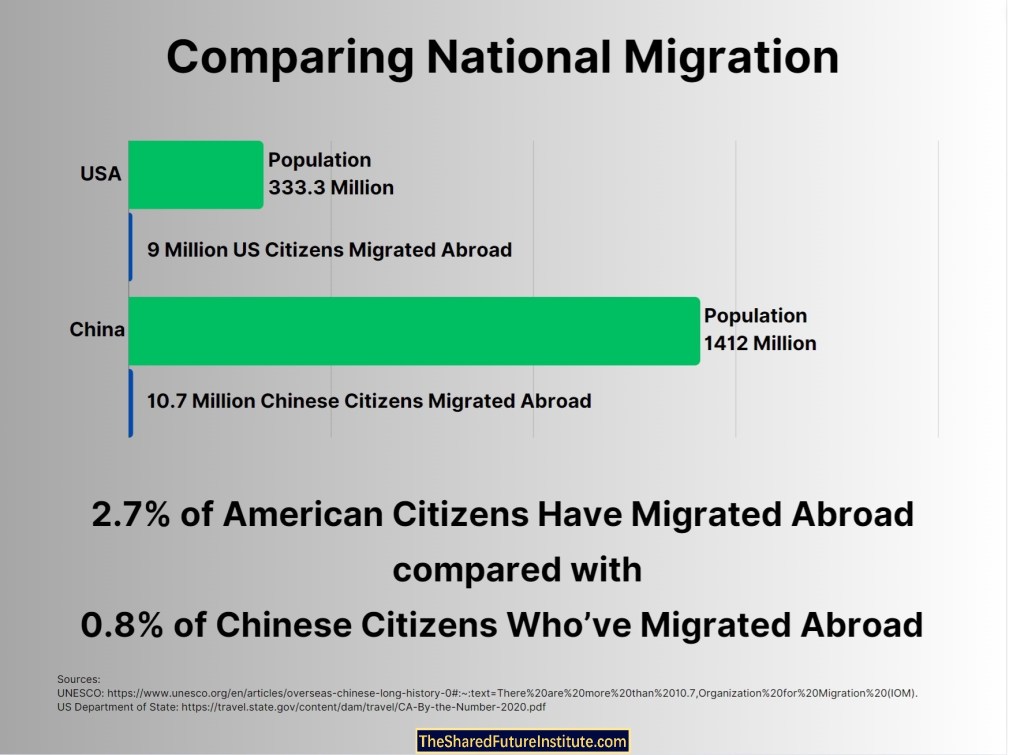 More US citizens migrate out of the US to live abroad than Chinese migrate out of China to live outside their country of citizenship, as a percentage of the respective populations. The fact of the matter is that American citizens are four times as likely to migrate out of the US and live elsewhere as Chinese are to leave their home country to live elsewhere.