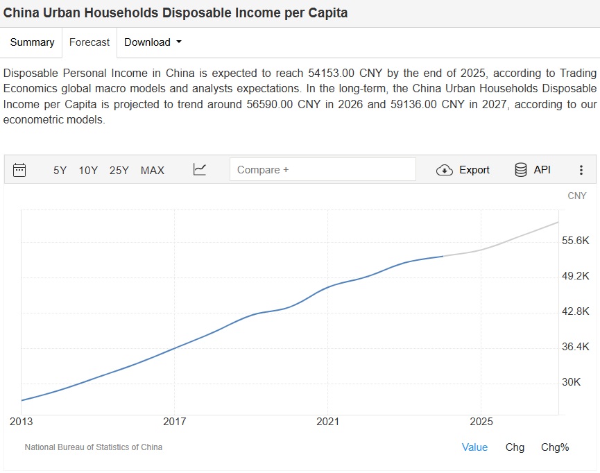 It should matter most how much money people have to live their lives. So let’s take a look at ‘China Urban Households Disposable Income per Capita.” This is the amount of money people can spend after they pay their necessary bills. This has been steadily increasing by about the same rate as it has for the last decade. China’s economy is delivering better lives for its people every year, at roughly the same rate as it has for the 21st century to now. Nothing is ‘slowing.’