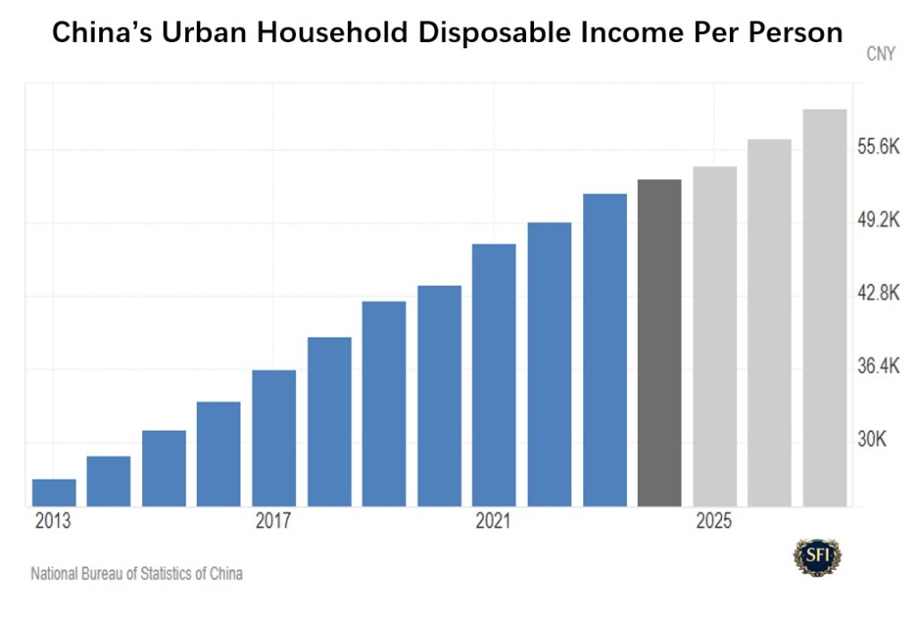 Many articles harp on China’s ‘slowing’ economy without giving clear context to their readers about the nature of the math which necessitates that process. A Reuters headline on October 15th, 2024 was entitled “China’s economy set to grow 4.8% in 2024, missing target: Reuters poll” emphasizing the ‘missing’ of China’s official target of ‘about 5%.’ This is a distortion for two reasons. The first, 4.8% is about 5%, and as of January 5th, writing this article, the GDP growth of China has been revised upward to 4.9%, which is even closer to being ‘about 5%.’ Another example, Nikkei published an article on December 26th, 2024 “China’s GDP growth to decelerate to 4.4% in 2025, say economists.” The term decelerate misleads non-economists, but not people in the know. As China’s economy continues to add the same growth each year it has for the last two decades.