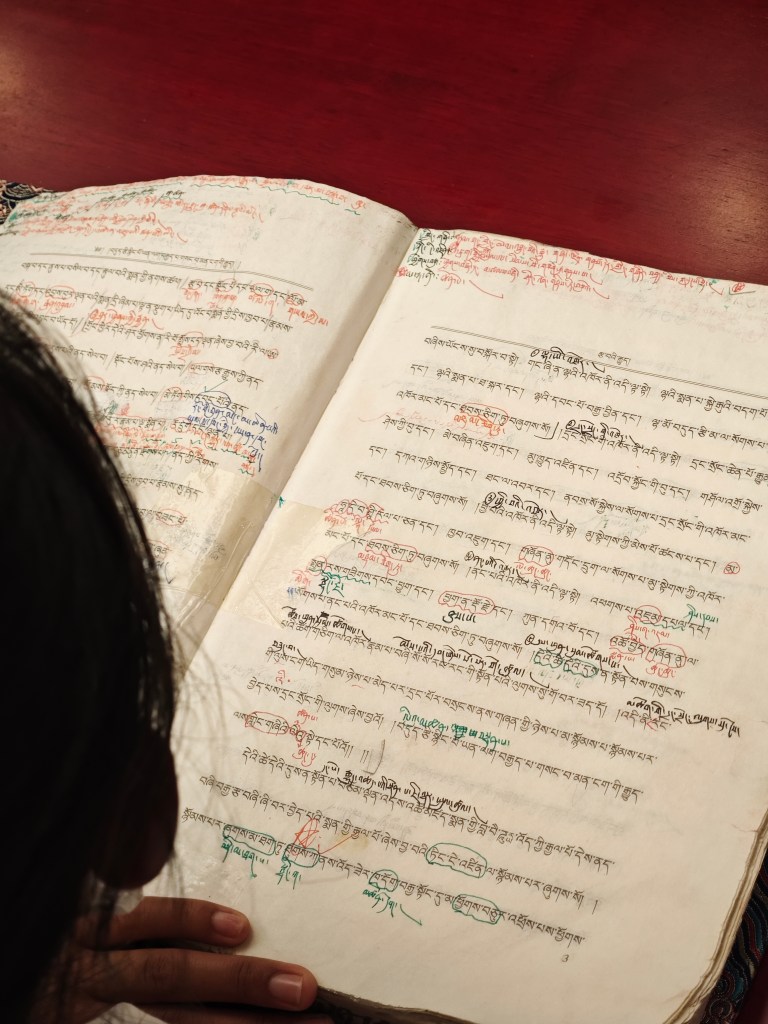 In 2025, just now, I took another week-long trip to Xizang. This time my plane landed in Nyingchi. My purpose: to visit as many schools as I could. My first stop was a local university, the Xizang Agricultural and Animal Husbandry University. I asked to be shown classes teaching Tibetan, but I wasn’t prepared for what I saw. The first class I entered was teaching the Tibetan alphabet, but these were non-Tibetan students. It turns out that all non-Tibetans are required to learn Tibetan at this university. The students in the class were primarily Han majority ethnic students. I checked their books and found notes in pen for the first couple months of school.