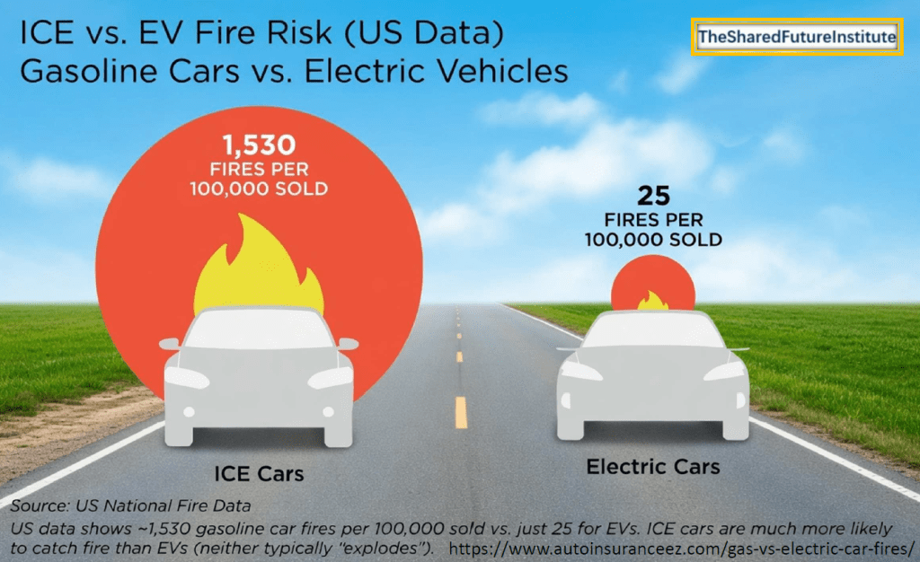 Gasoline-powered internal combustion engine (ICE) cars experience approximately 1,530 fires per 100,000 vehicles sold. In stark contrast, EVs see just 25 fires per 100,000 sold. This means ICE vehicles are over 60 times more likely to catch fire (https://www.autoinsuranceez.com/gas-vs-electric-car-fires/).
